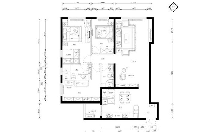 設計思路說明此戶型為三口之家,兩位老人帶孩子,風格定義為現代風格。需要有孩子的活動玩耍空間,所以把起居室分割為會客廳及活動區,而原有就餐區移到原廚房,做一開放式廚房餐廳于一體,獨立的門廳部位,這樣可以更好的區規劃。