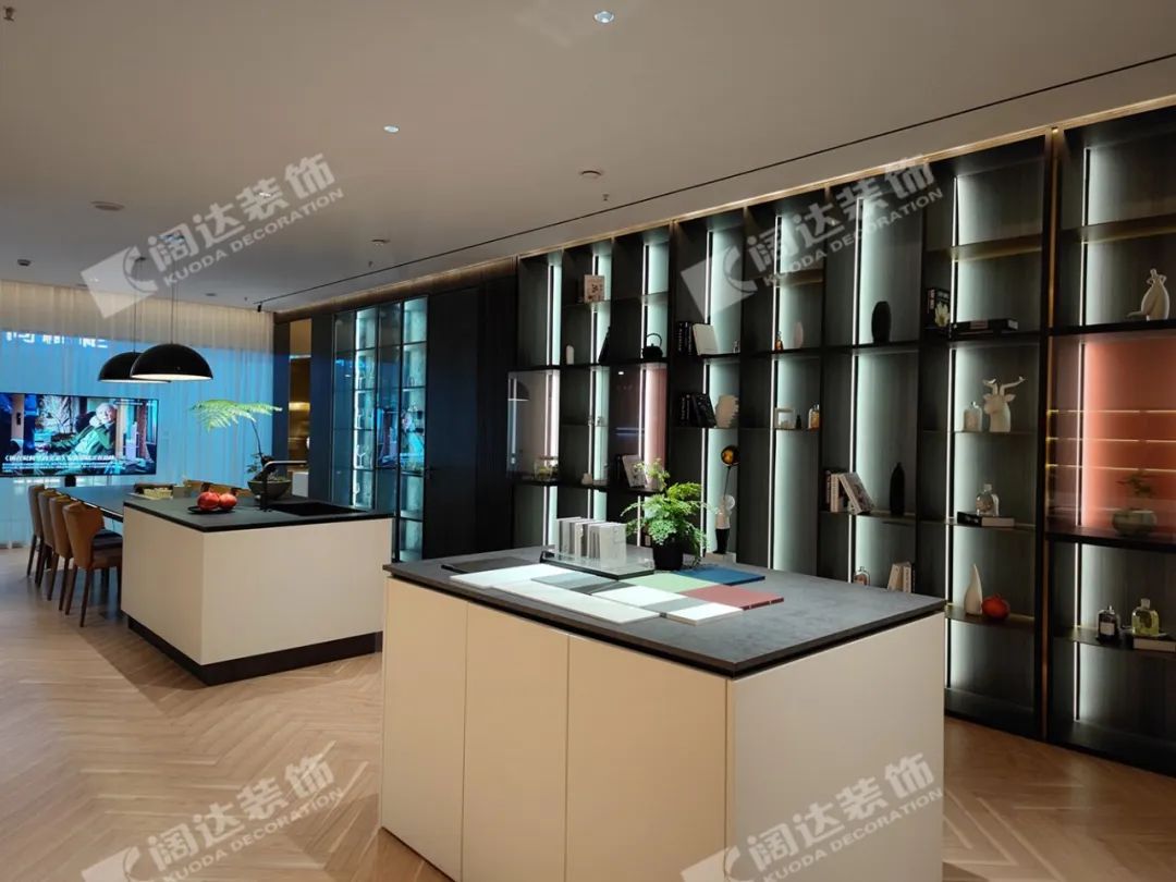 社交洽談區域采用當代最流行的膚感飾面制作一體化島臺桌面,既提升品質,又有觸碰島臺桌面時的舒適感,在餐桌的前后分別有大面積的玻璃酒柜和可封閉式西廚操作臺,桌面邊上采用軌道插座,實用的設計,滿足了用餐和辦公的雙重需求。