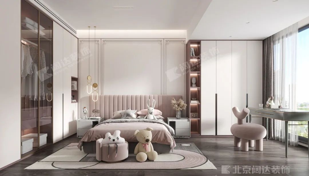 主臥空間的處理趨于簡潔。床頭背景采用了灰色混油面板,使用了柔和的線條燈,除了美感之外,渲染出親切的生活底色。