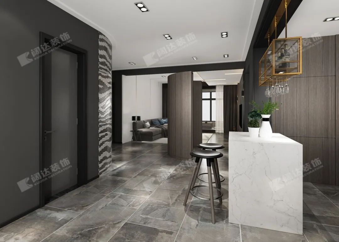 為了滿足業(yè)主大淋浴房的需求,客廳做出一個馬賽克飾面弧形墻,在擴(kuò)大淋浴區(qū)面積的同時,形成了一道獨(dú)特的風(fēng)景線。