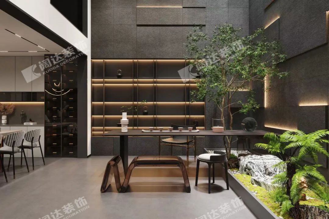 地下室茶室:設計,源于生活,更優于生活。將自然與室內結合,適當增加綠植,不僅增強了空間與自然的溝通和互動,也緩解了地下室相對閉塞的通病,有了細致與粗獷的反差,為生活增添一些新鮮感。
