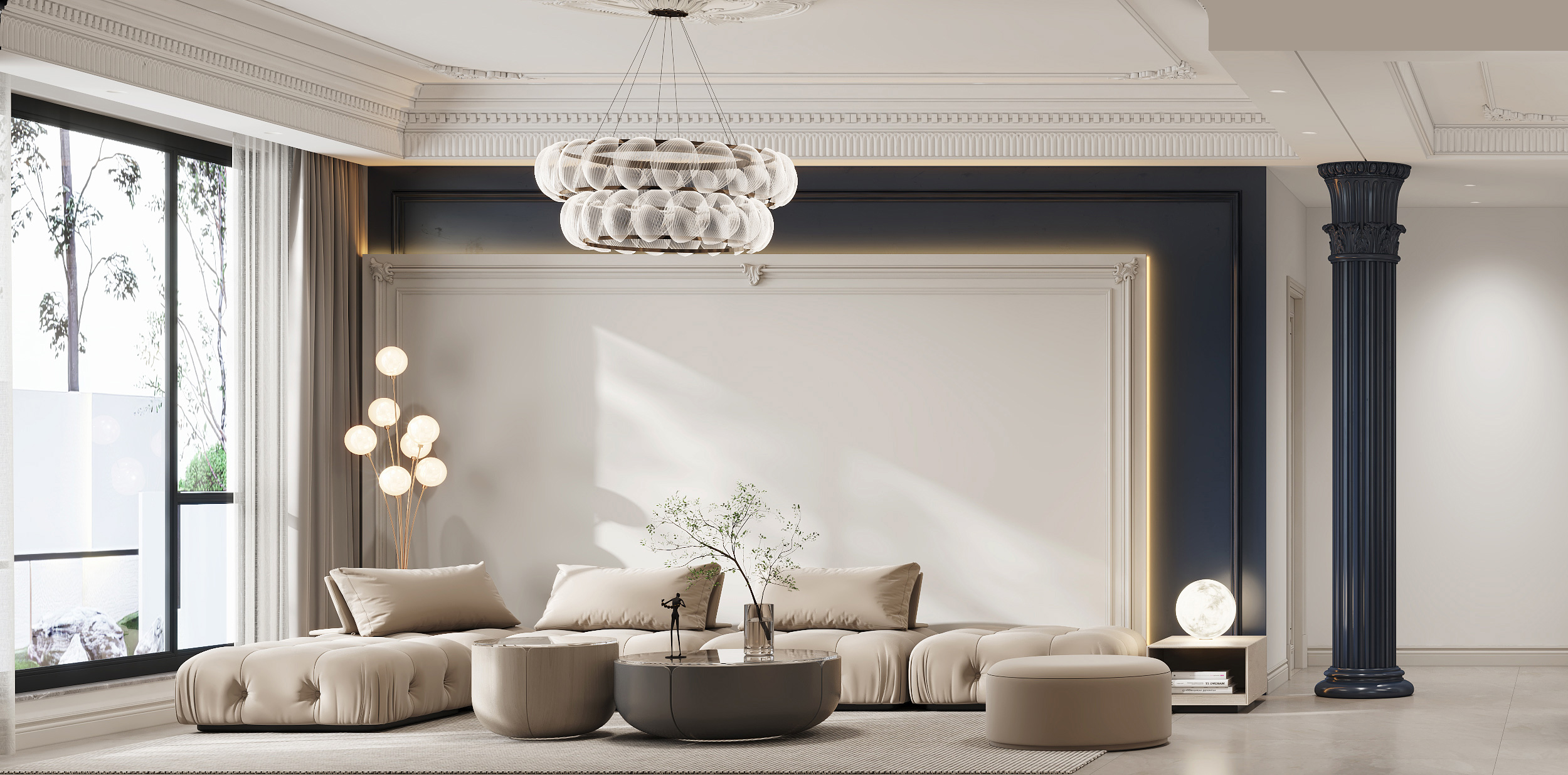 頂面?zhèn)裙猓箖?yōu)美的石膏線條更具層次感,保證了視覺上的明凈簡約,空間采光也更通透明亮。