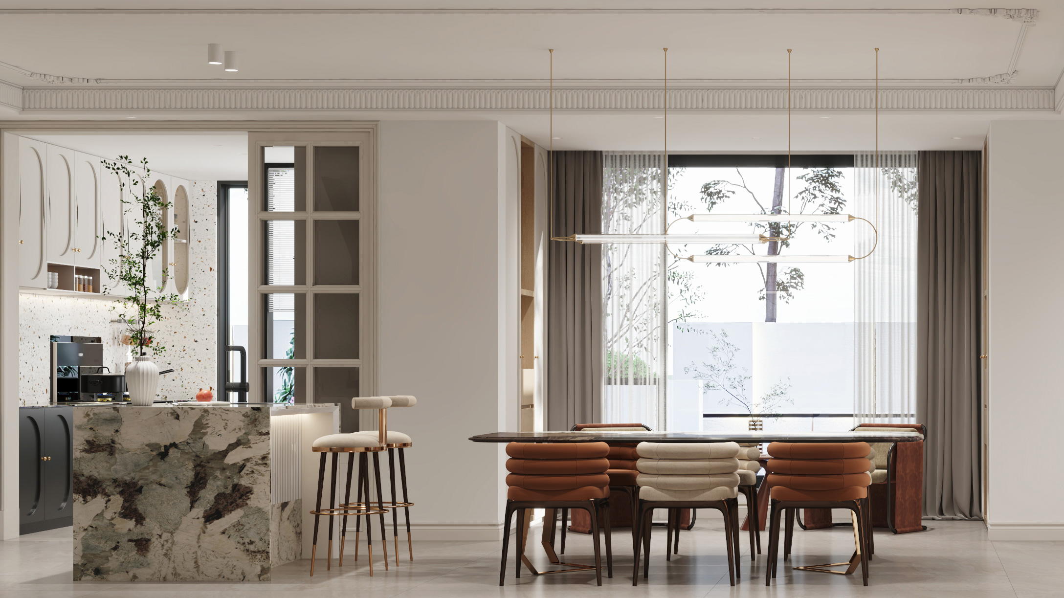 在延續(xù)了客餐廳整體基調(diào)外,會客區(qū)主背景別具一格的潘多拉石材與法式線條相結(jié)合,加上右邊漸變亞克力裝飾柜的跳躍,讓整個背景在保證法式浪漫主義的同時,凸顯年輕的活力與色彩。
