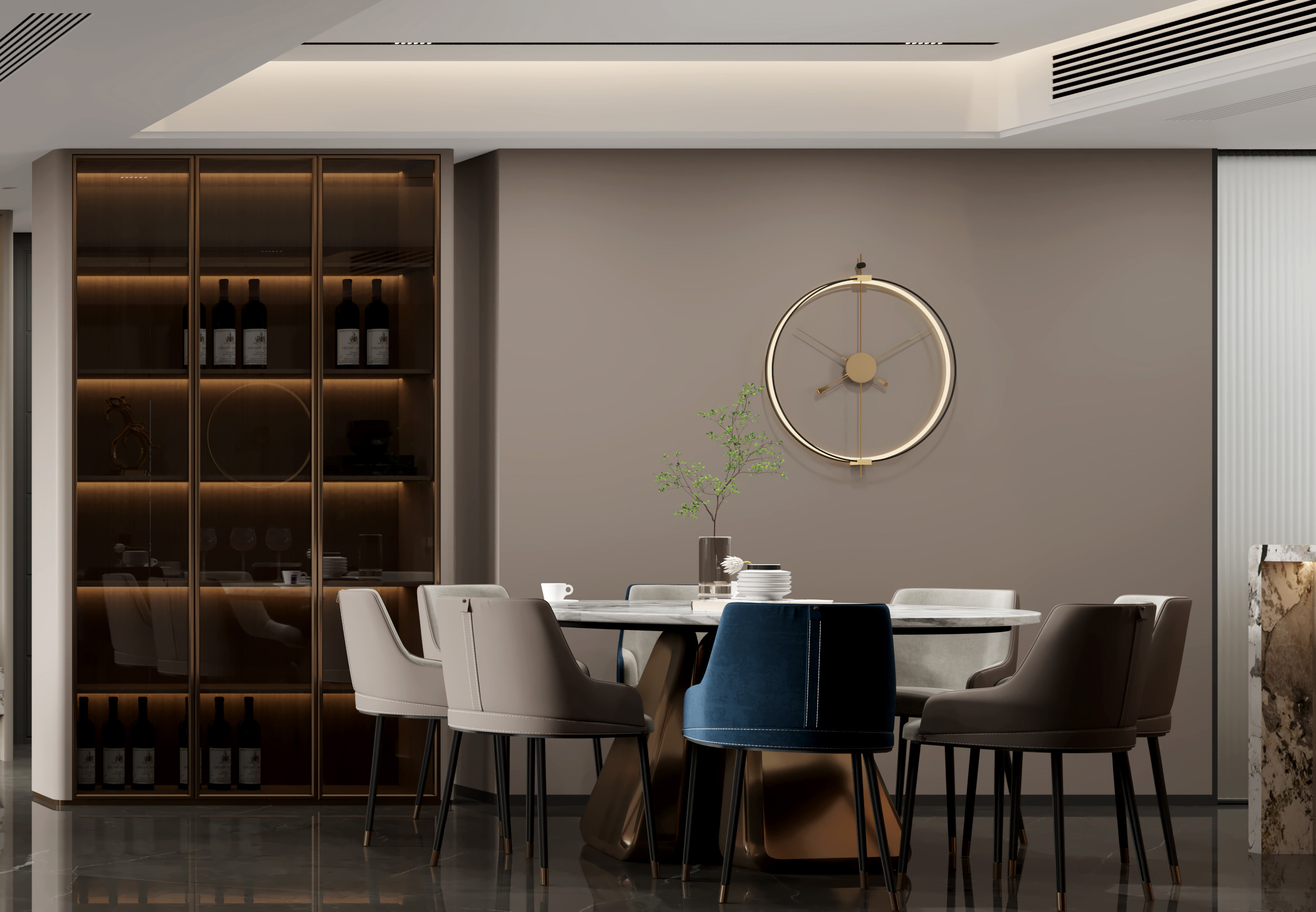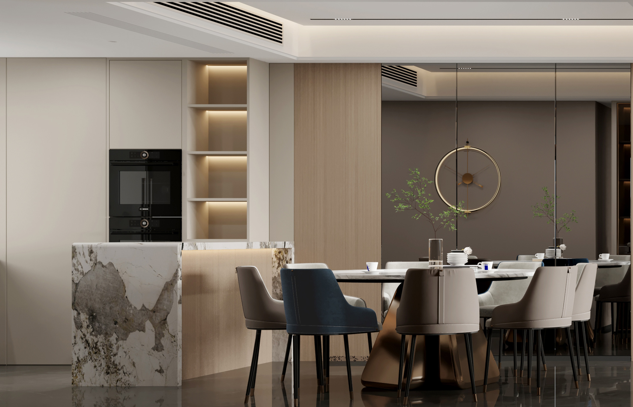 此風格通常采用對比、統一、節奏、韻律等形式美的設計語言,主導空間,突出現代形式感。