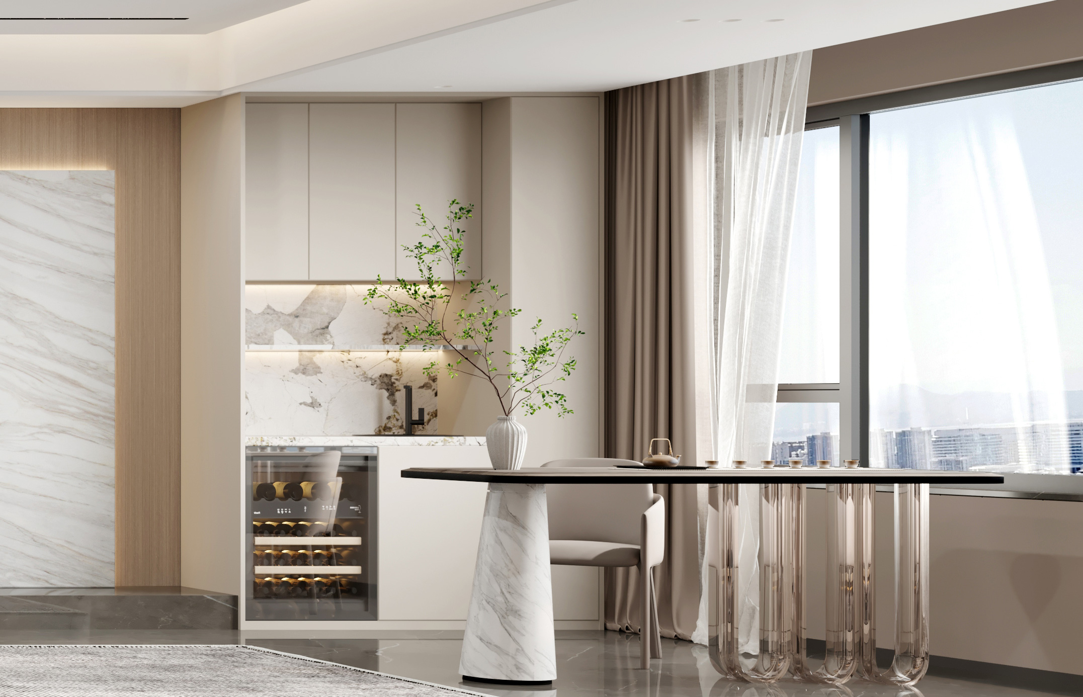 將室內的各種設計元素在視覺上精簡到最少,減少裝飾、大尺度、低限度地運用形體造型。