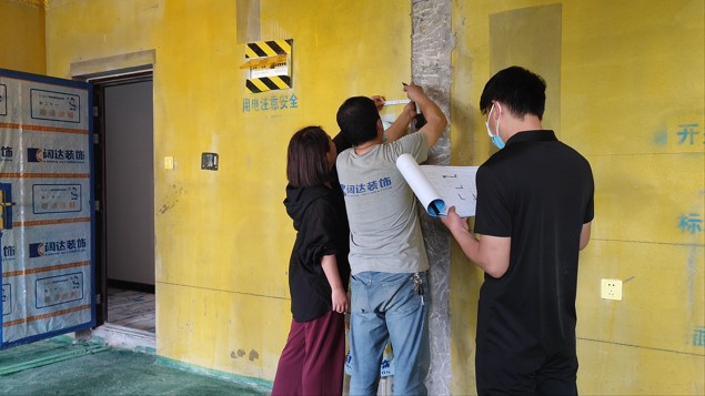 客戶、設計師、管家及水電師傅,現場確定水電位置,管家以文字加圖片形式發送至微信服務群,告知客戶今天交底的內容,待客戶確認后方可施工。